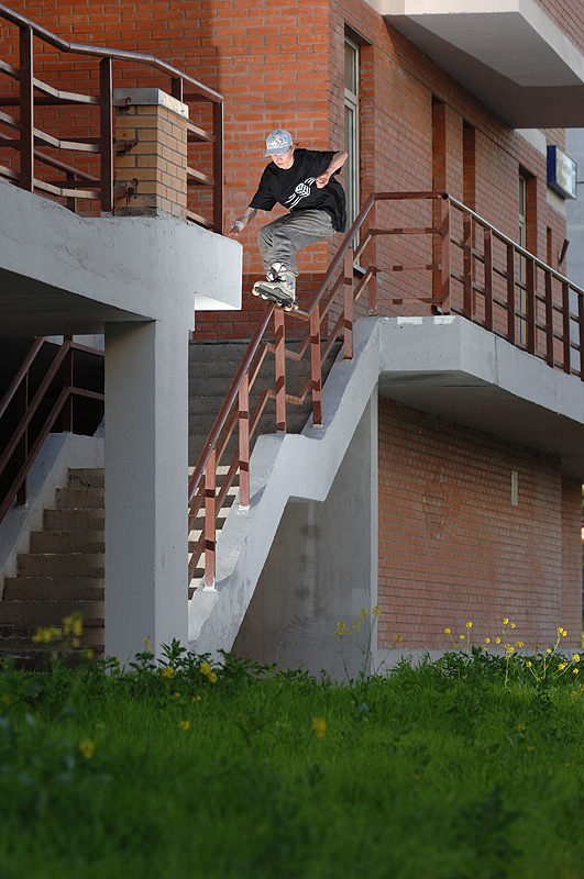 Новогиреево Сложность данного трюка в том, что сходить надо обязательно с кинка, иначе козырек снимет пол черепа. Андрей минут 30 нервничал, никак не мог решиться. Вторая сложность - это сход через газон. Ждите видео, как говорится. |